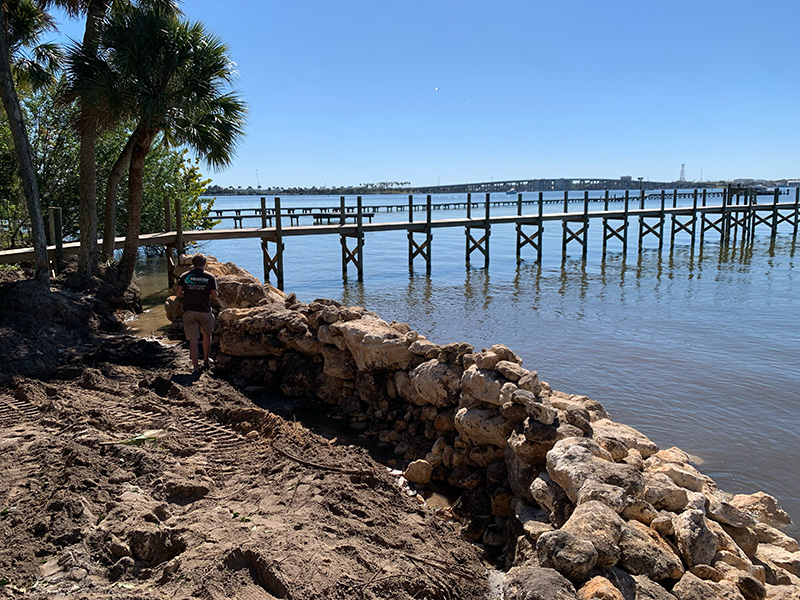 Completed phase of a seawall construction by High Surf Corp, showing the placed coquina rocks forming the seawall along the shoreline. The area has been filled in and landscaped, with a view of the waterfront and surrounding greenery, highlighting the project’s progress and stability.