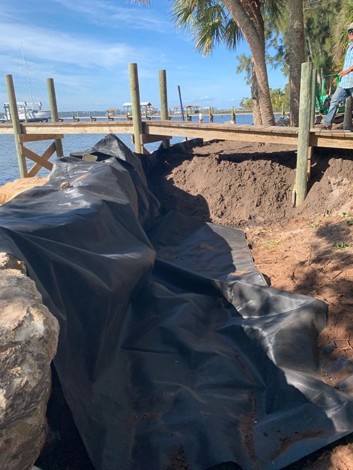 Geotextile fabric laid out along the shoreline to provide support and prevent sinking and slipping of rocks and stones. The image shows the preparatory phase with a scenic waterfront view and dock in the background.